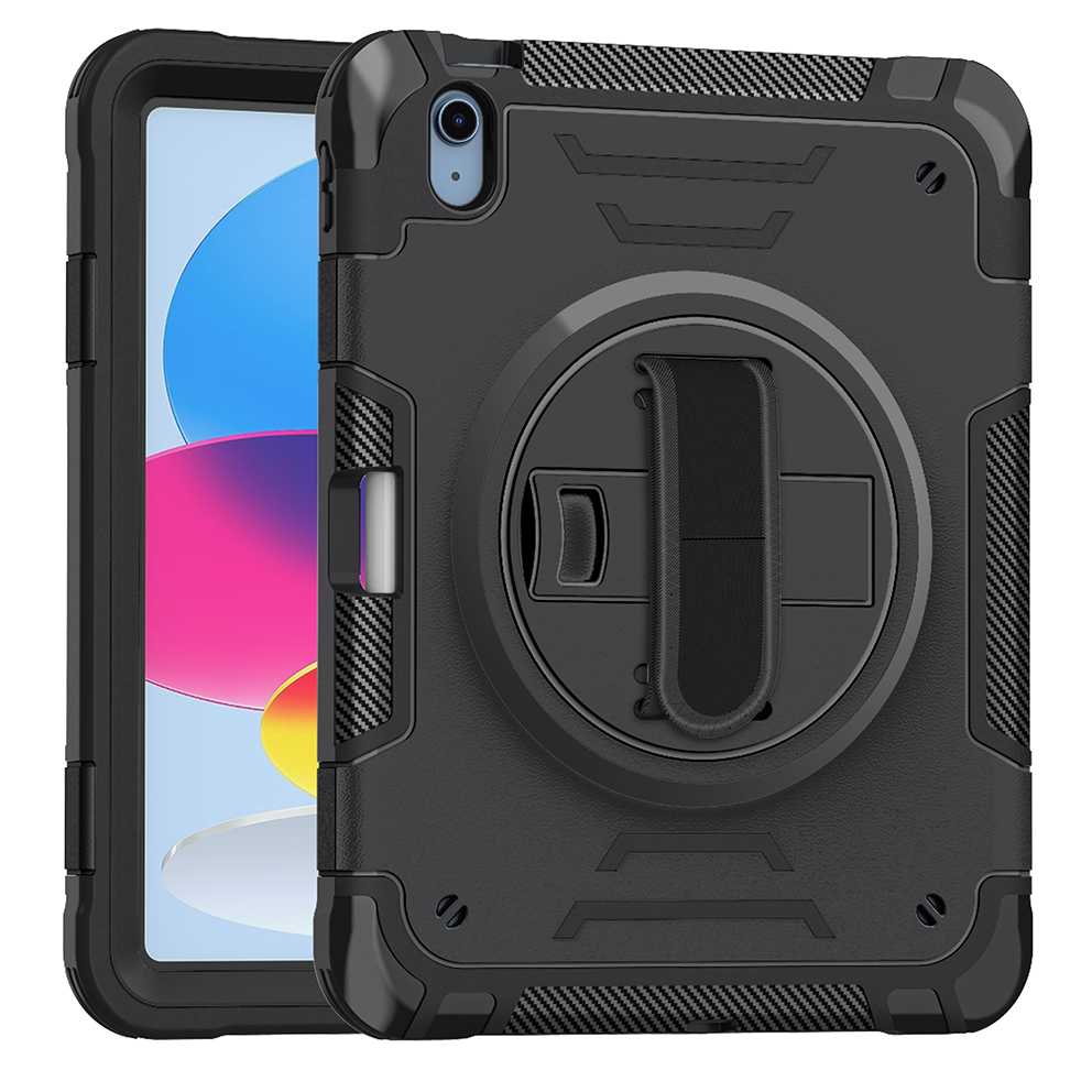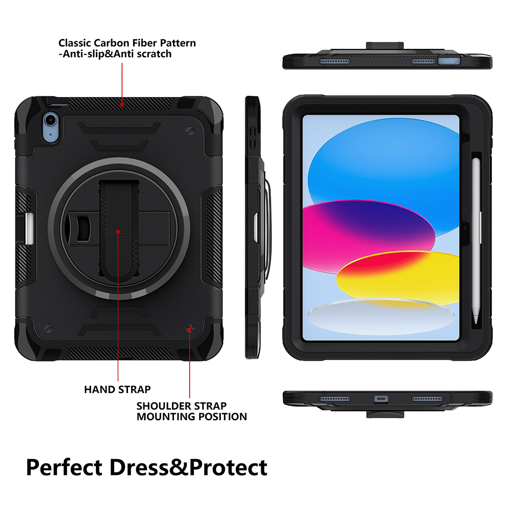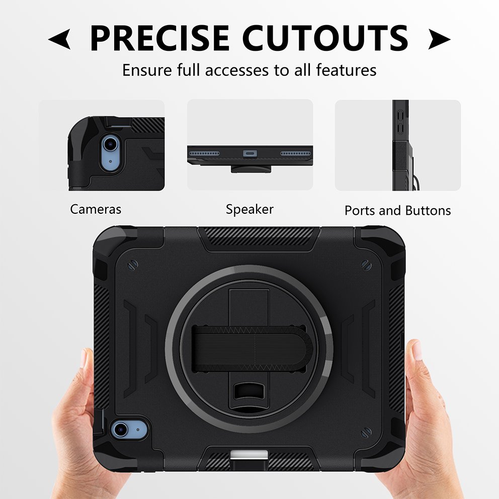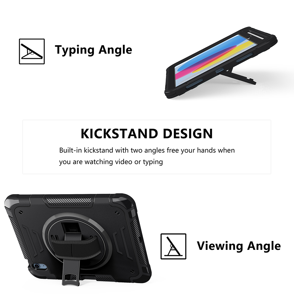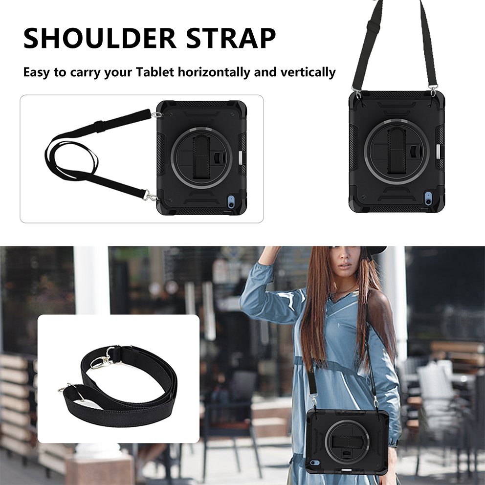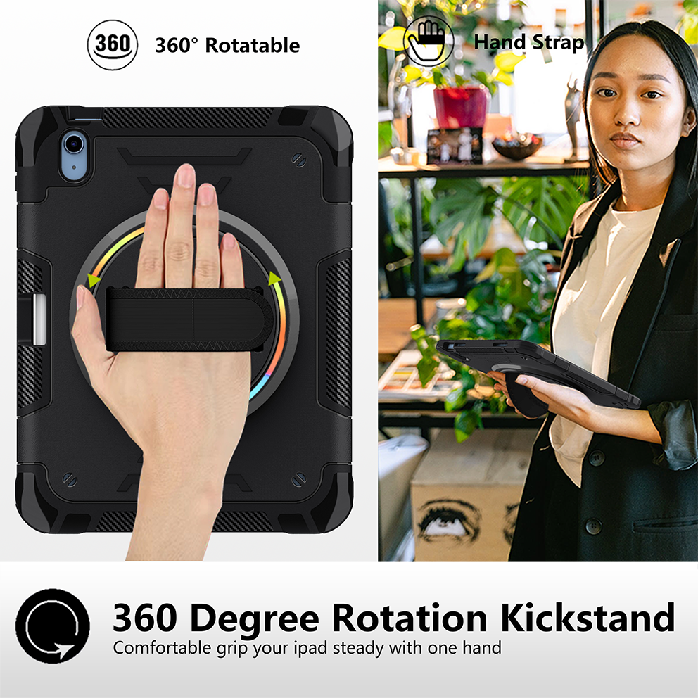 Professional black tablet case designed for iPad 11th 2025 (A16) 11 inch. Includes 360° rotating kickstand, hand/shoulder strap, and 3-layer rugged drop protection.