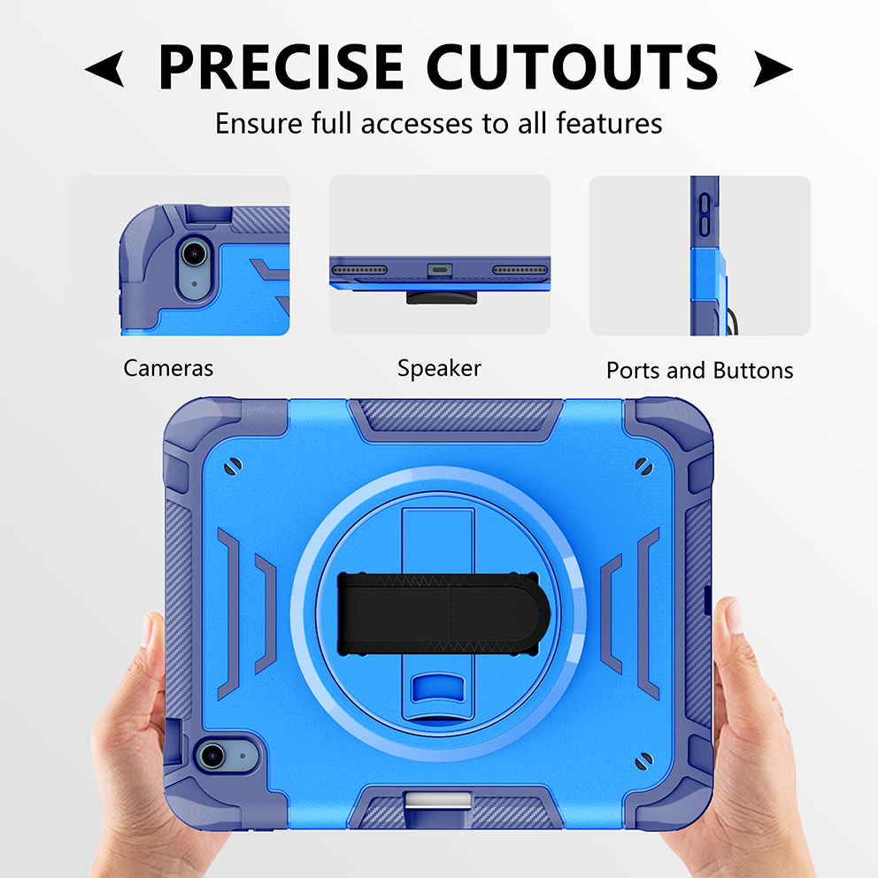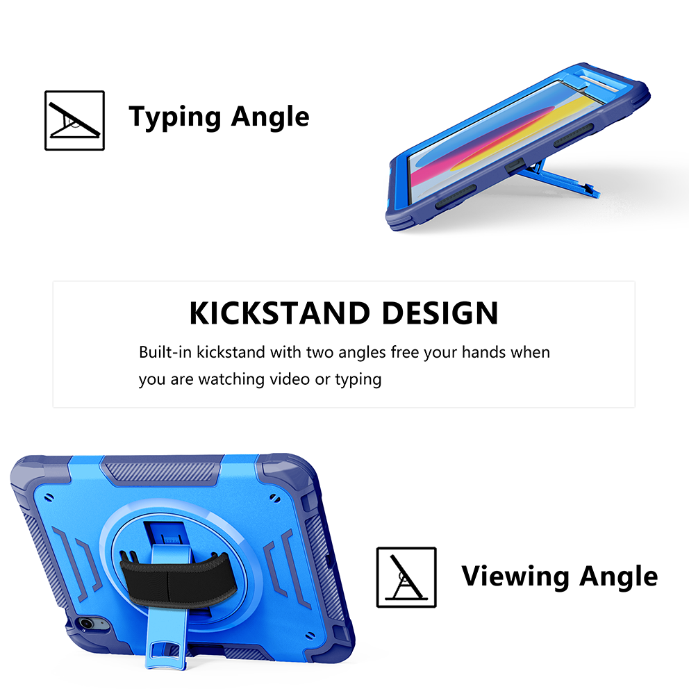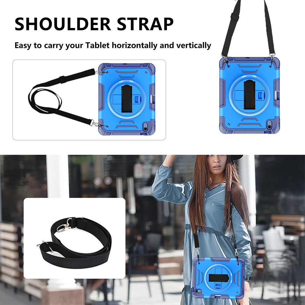 Sturdy blue iPad 11th 2025 (A16) 11 inch case with 360° kickstand and adjustable strap. Triple-layer shockproof design ideal for kids and outdoor use.