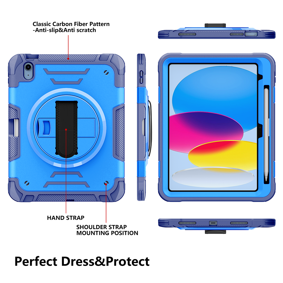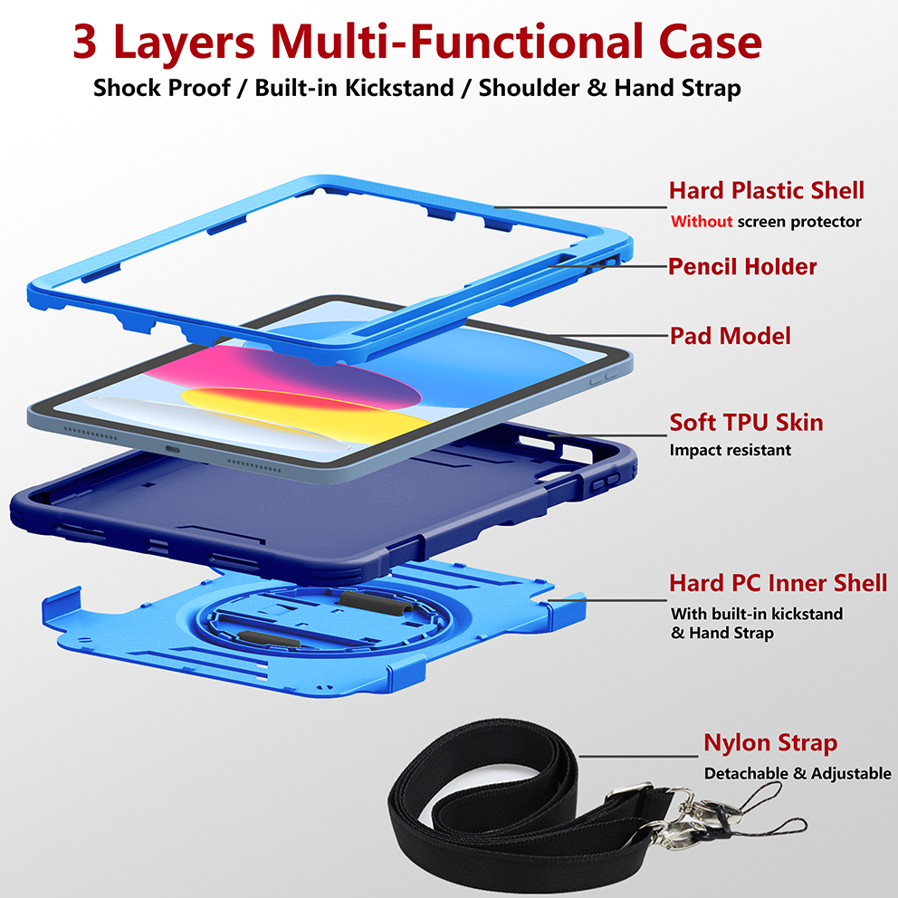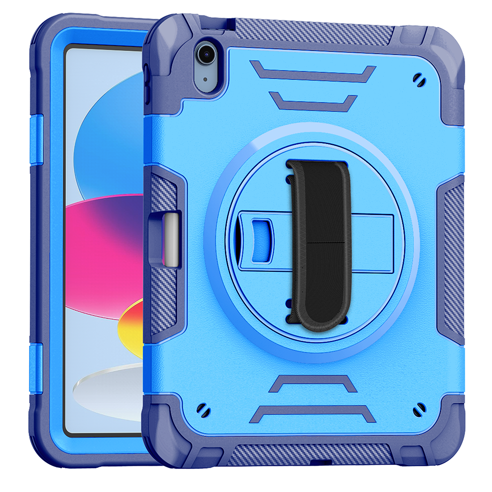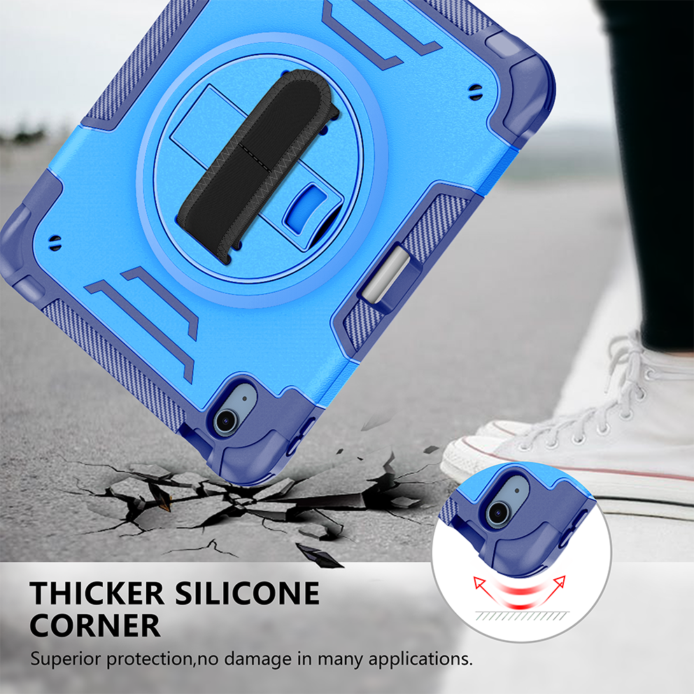 Sturdy blue iPad 11th 2025 (A16) 11 inch case with 360° kickstand and adjustable strap. Triple-layer shockproof design ideal for kids and outdoor use.
