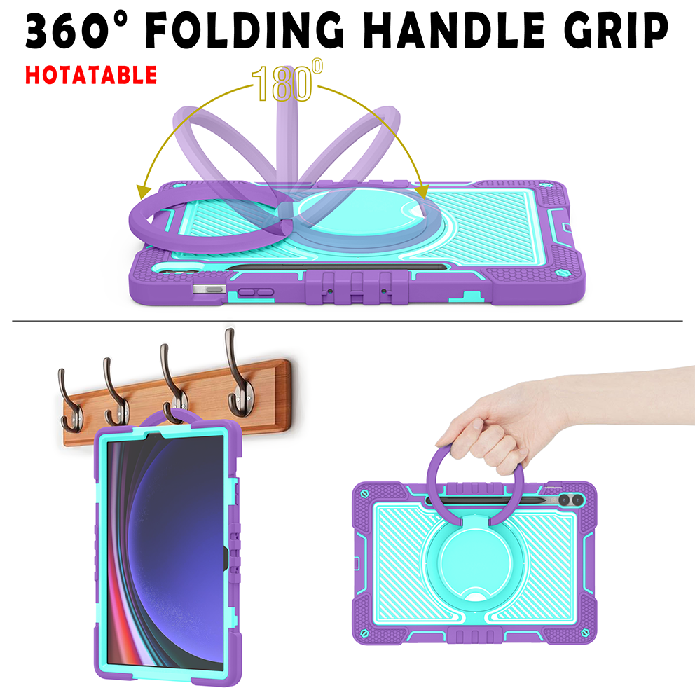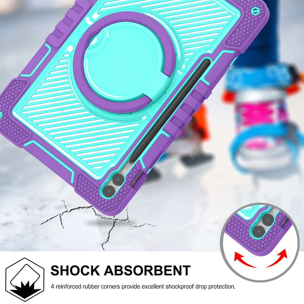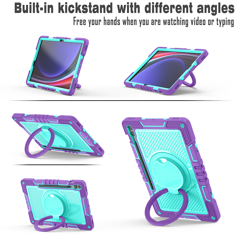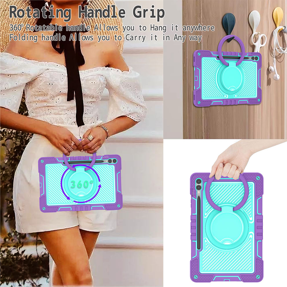 Full-Body Rugged Silicone Protective Cover with Rotating Hand Strap and Multi-Angle Kickstand for Galaxy Tab S9 Plus 12.4'' - Purple & Mint Green