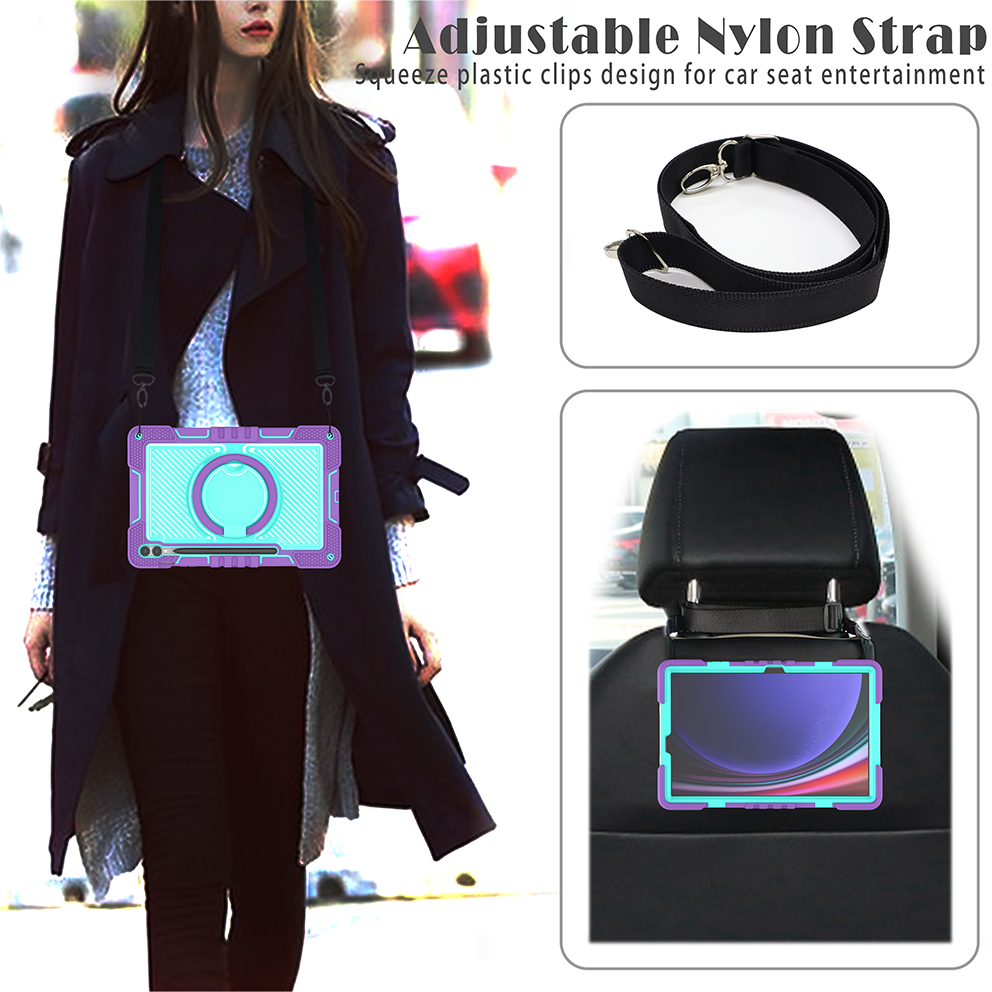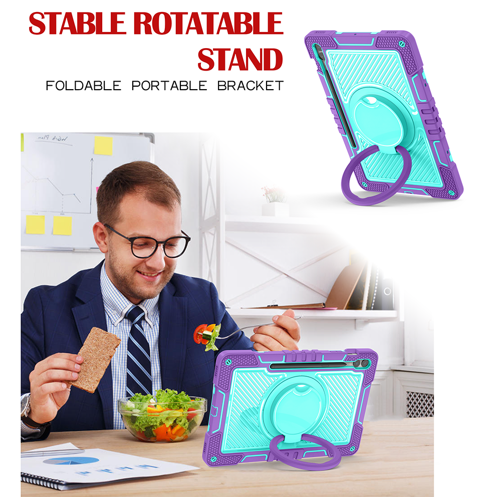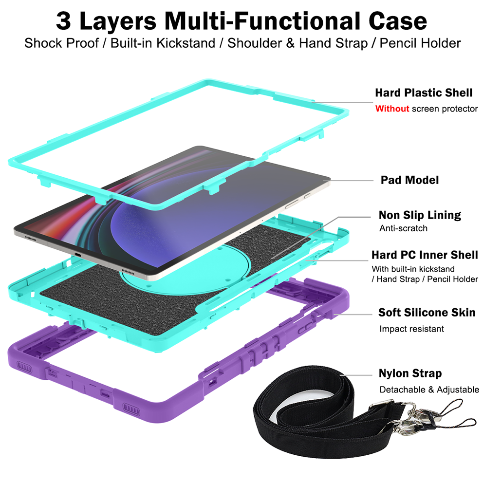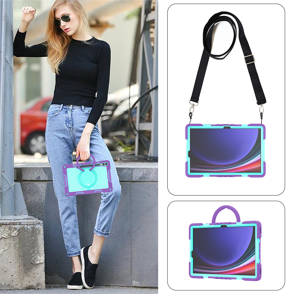 Full-Body Rugged Silicone Protective Cover with Rotating Hand Strap and Multi-Angle Kickstand for Galaxy Tab S9 Plus 12.4'' - Purple & Mint Green