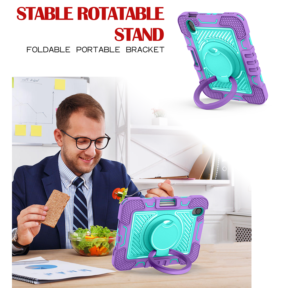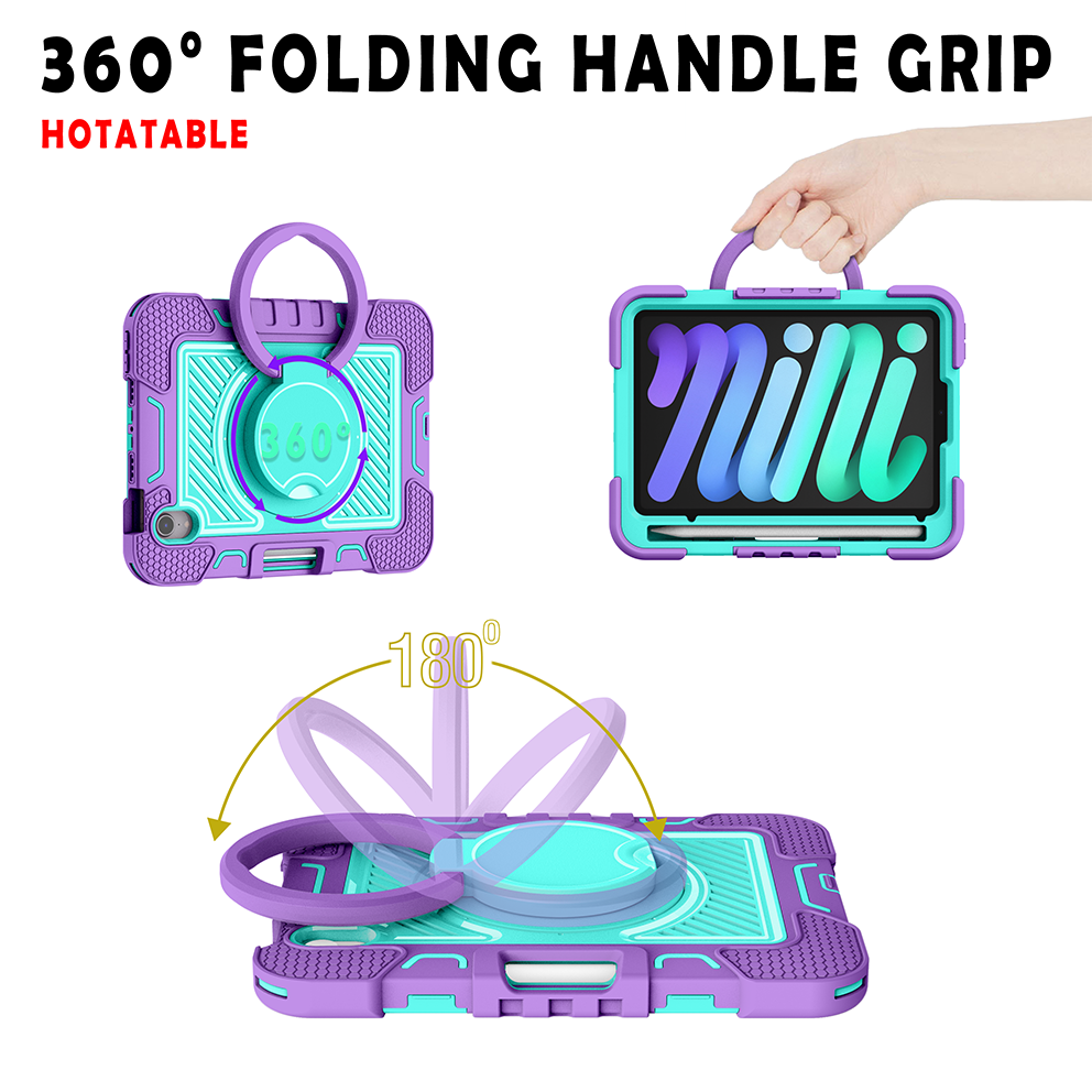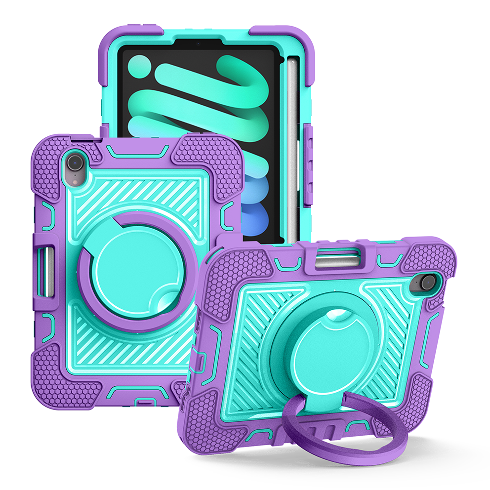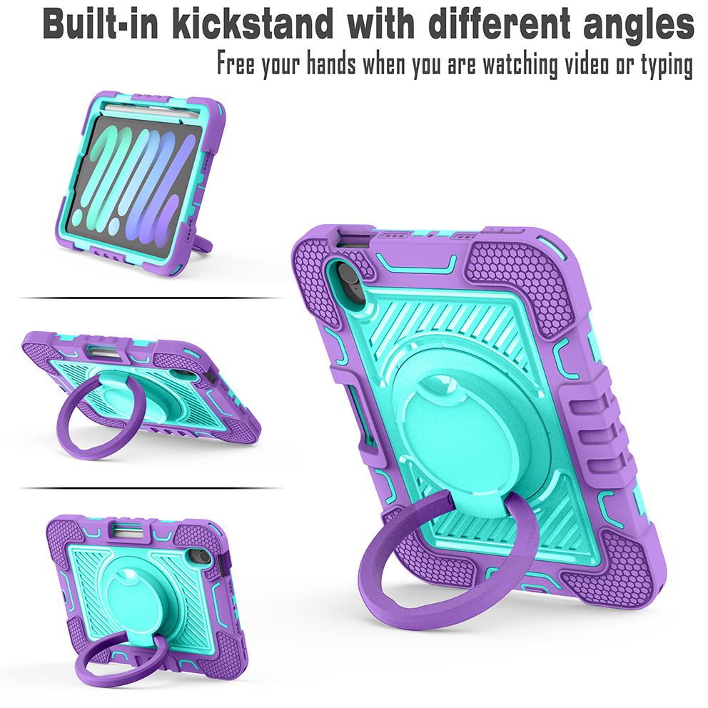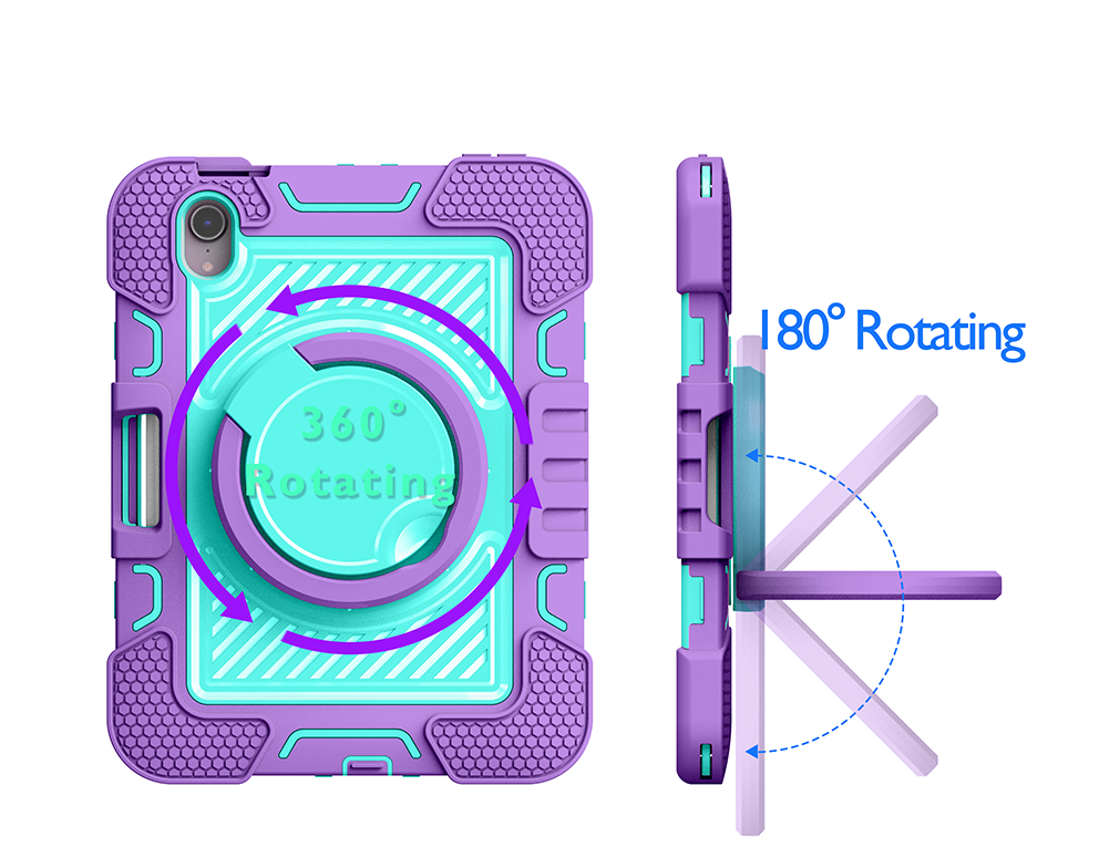 Stylish and protective purple & mint green case for iPad Mini 7. Features 360° rotating ring, shockproof layers, and adjustable strap for versatile use.