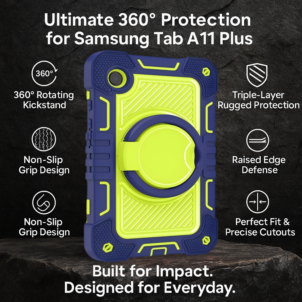 This rugged case combines durable protection with flexible functionality. Featuring a 360° swivel ring stand, shock-absorbing triple-layer build, and kid-friendly grip design, it's the perfect choice for safe and stylish Samsung Tab A11 Plus usage.