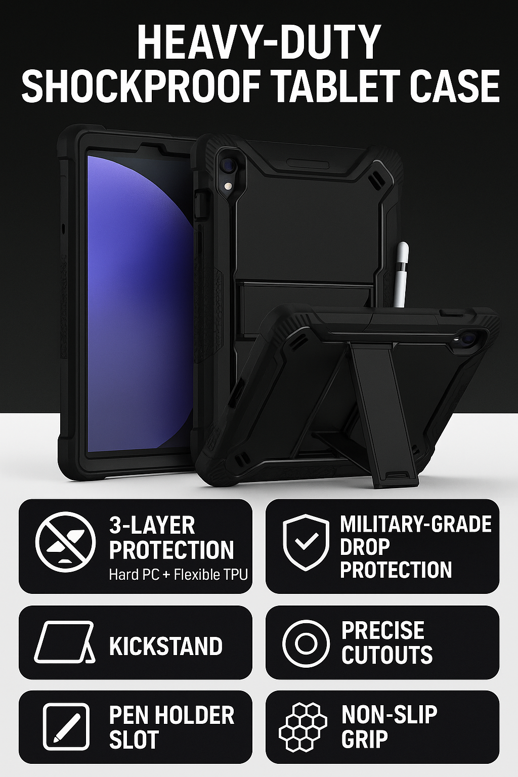 This Heavy Duty Shockproof Silicone Case for Samsung Galaxy Tab S10 Lite X406B/S10FE/S9 FE/S9 is an amazing, multifunctional case that protects your brand-new Pad at all costs. The heavy-duty case even has a pencil holder and a built-in kickstand for your convenience.
