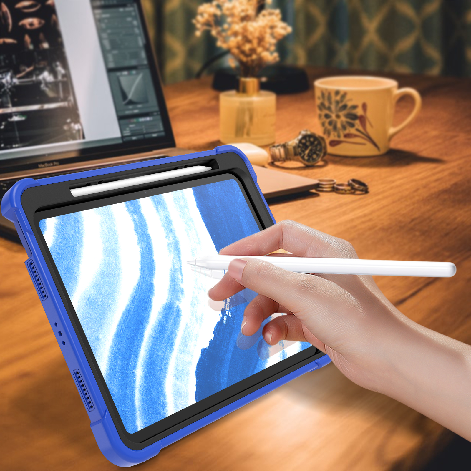 Dark Blue+Black heavy duty iPad case for iPad Air 11-inch M4 (2026). Triple-layer PC+silicone rugged protection with anti-slip grip, raised edges, precise cutouts and built-in kickstand for work, travel and kids learning.