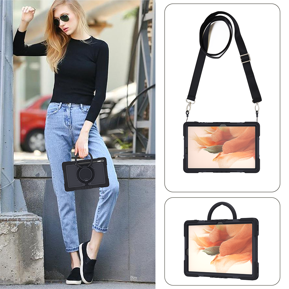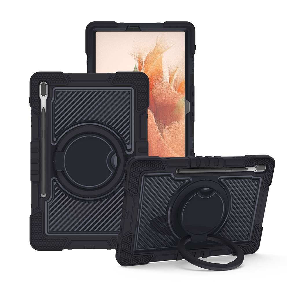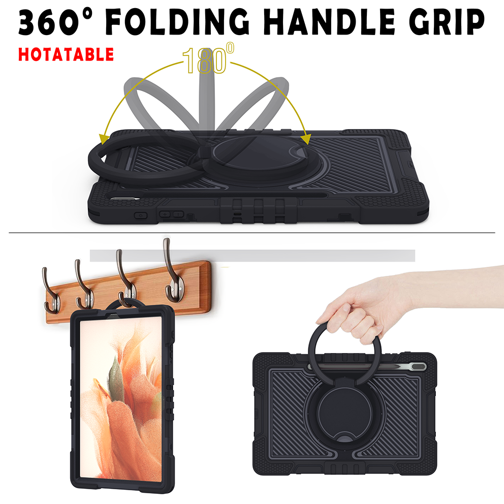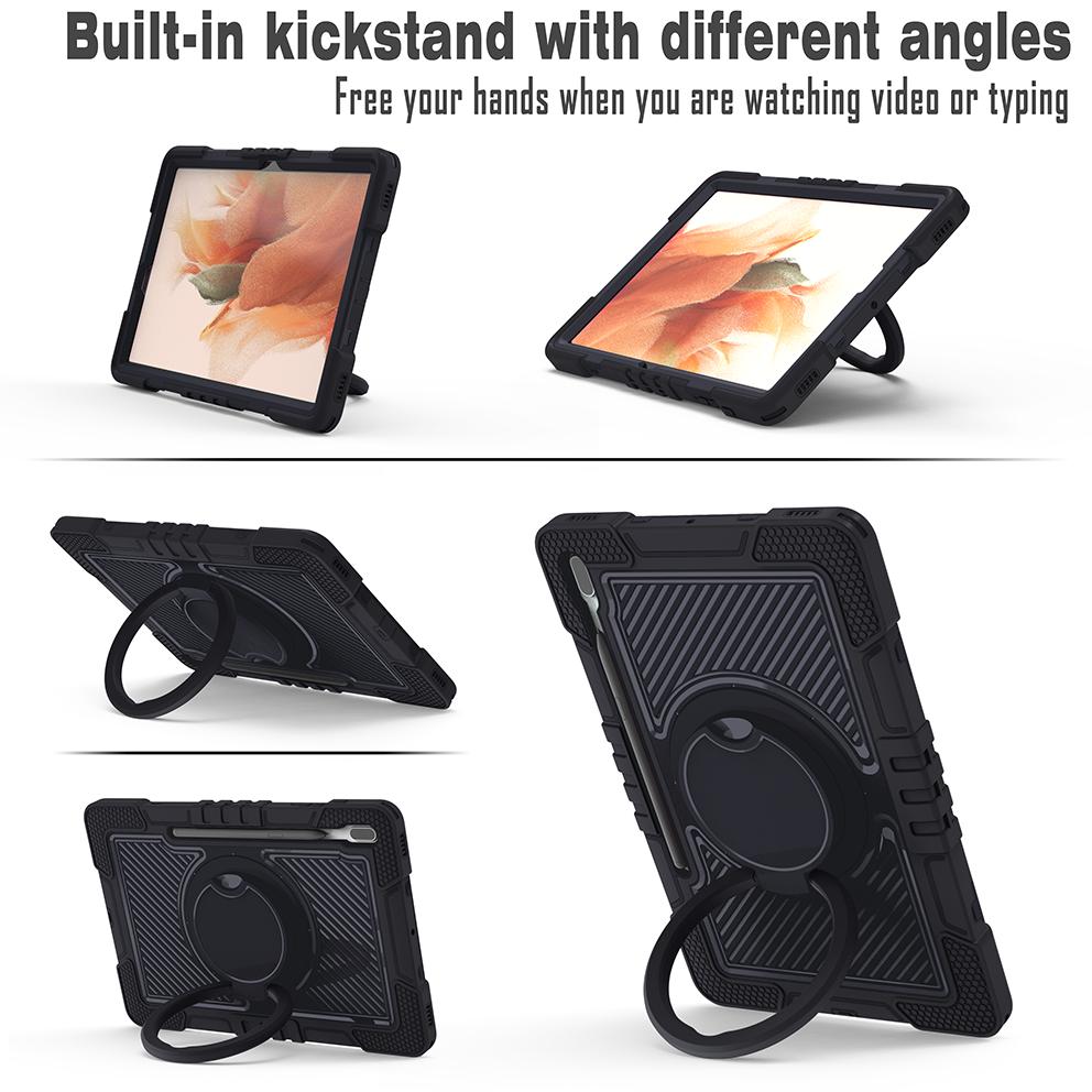 This all-black rugged case for Samsung Galaxy Tab S7 FE 12.4" delivers full-body protection with a sleek, professional look. Designed for both function and durability, it includes a 360° rotating ring kickstand, rotatable hand strap, and detachable shoulder strap—ideal for business, education, or fieldwork.