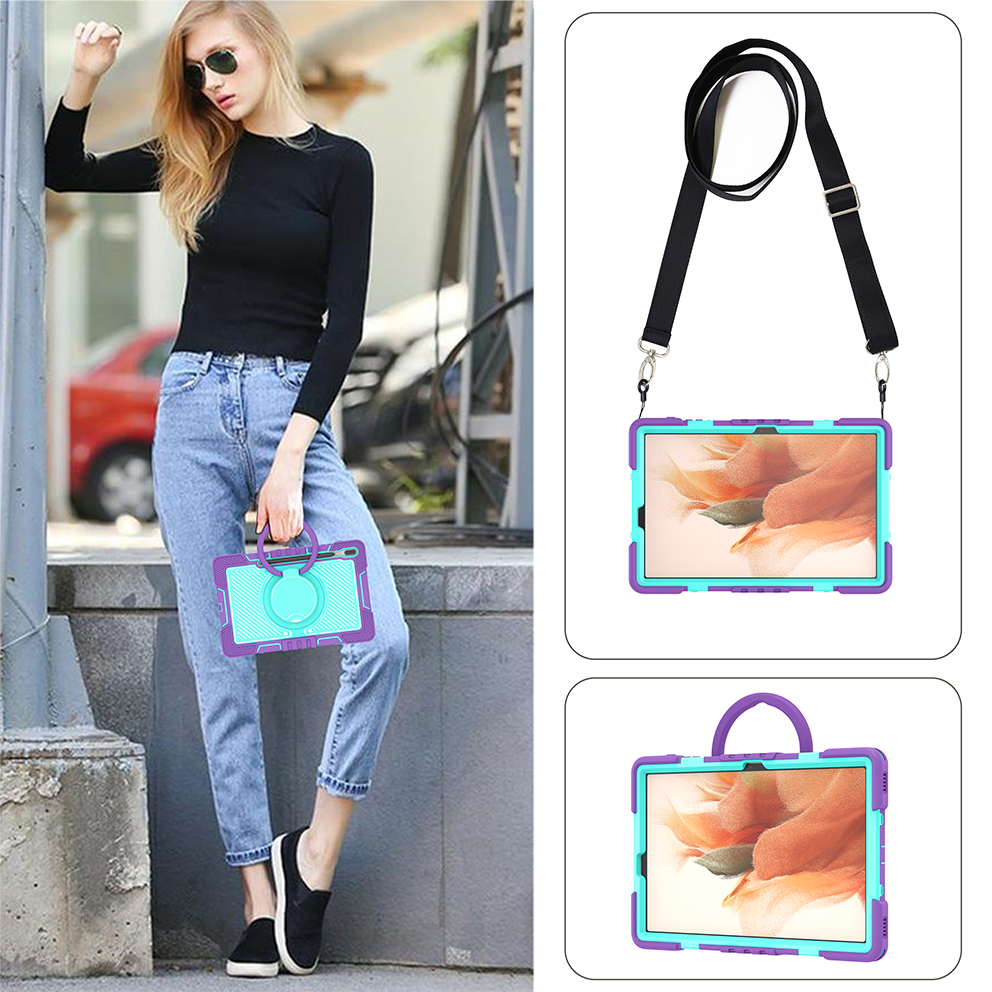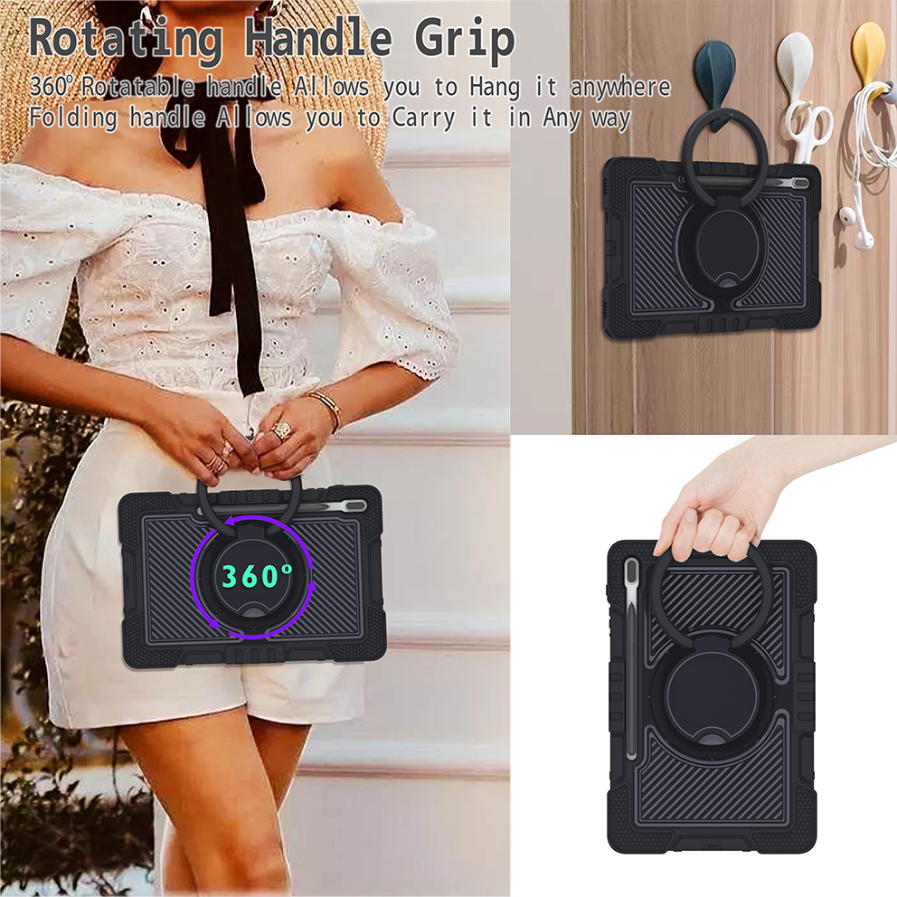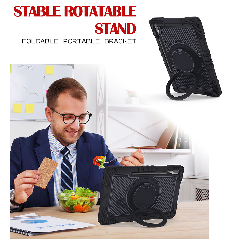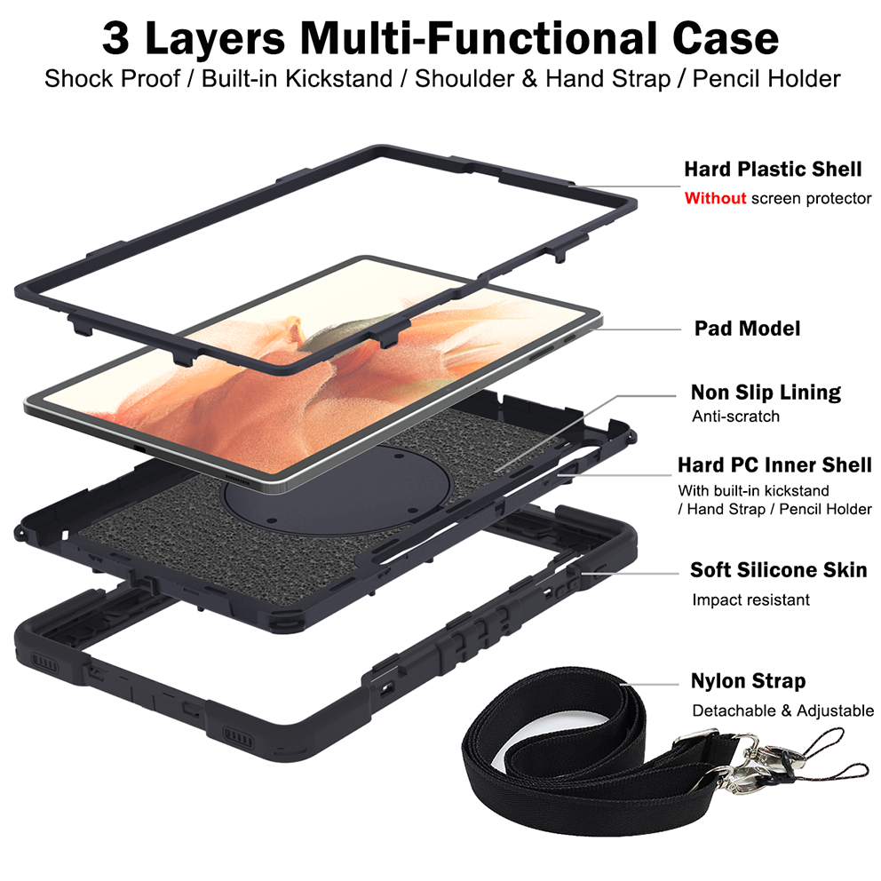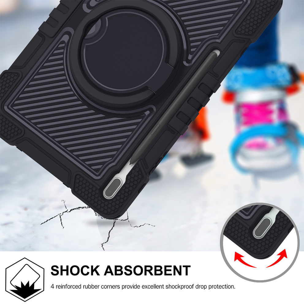 This all-black rugged case for Samsung Galaxy Tab S7 FE 12.4" delivers full-body protection with a sleek, professional look. Designed for both function and durability, it includes a 360° rotating ring kickstand, rotatable hand strap, and detachable shoulder strap—ideal for business, education, or fieldwork.