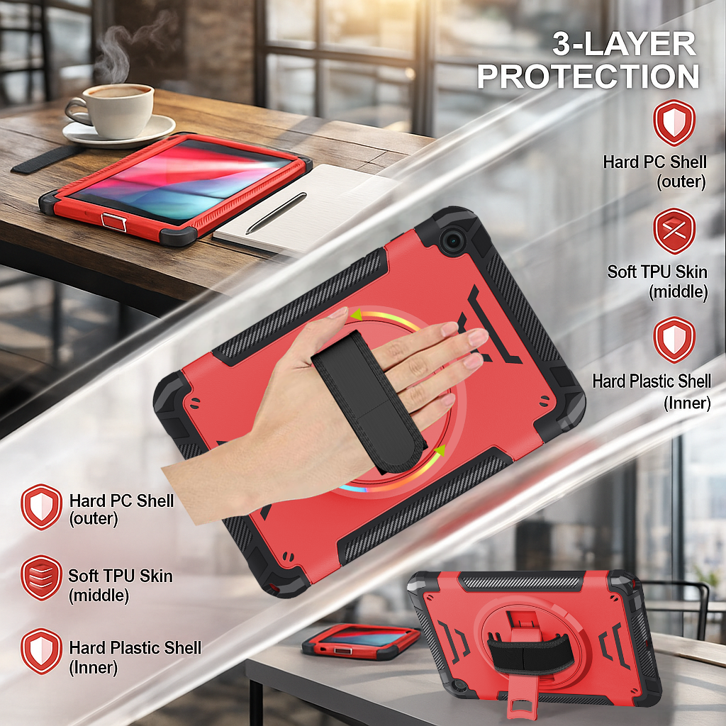 The built-in rotating hand strap allows effortless one-handed operation, perfect for students, field workers, teachers, and professionals who require tablet mobility and stability.