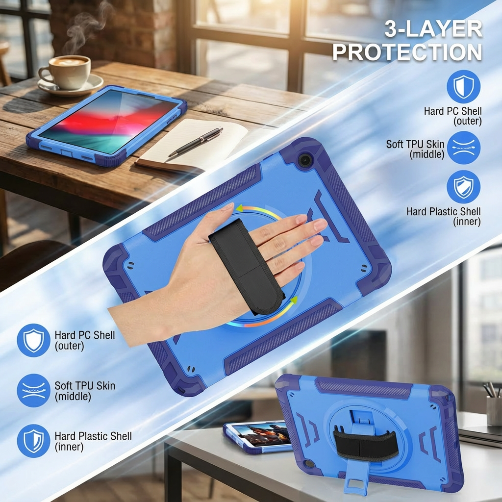 The built-in rotating hand strap allows effortless one-handed operation, perfect for students, field workers, teachers, and professionals who require tablet mobility and stability.