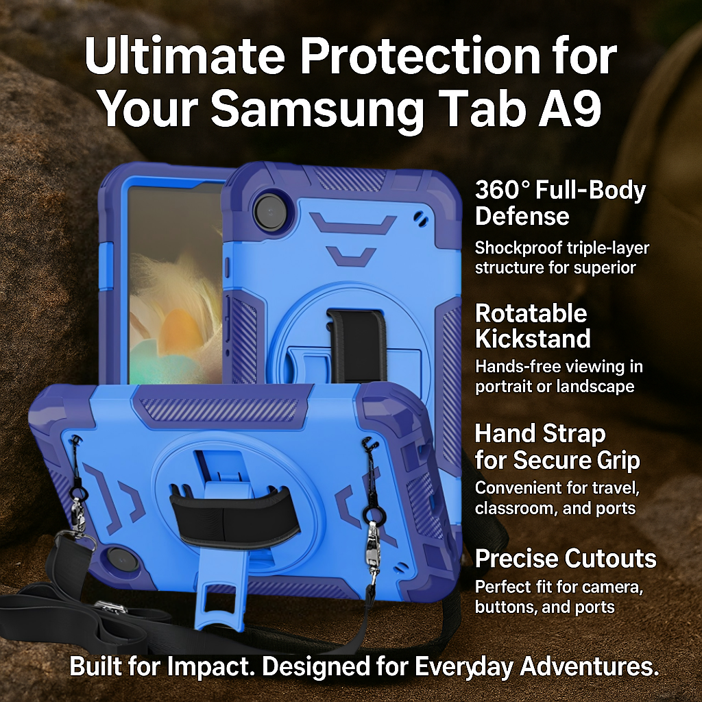 Tough and vibrant navy-blue kickstand case for Samsung Tab A9 – shockproof, sturdy, and reliable.