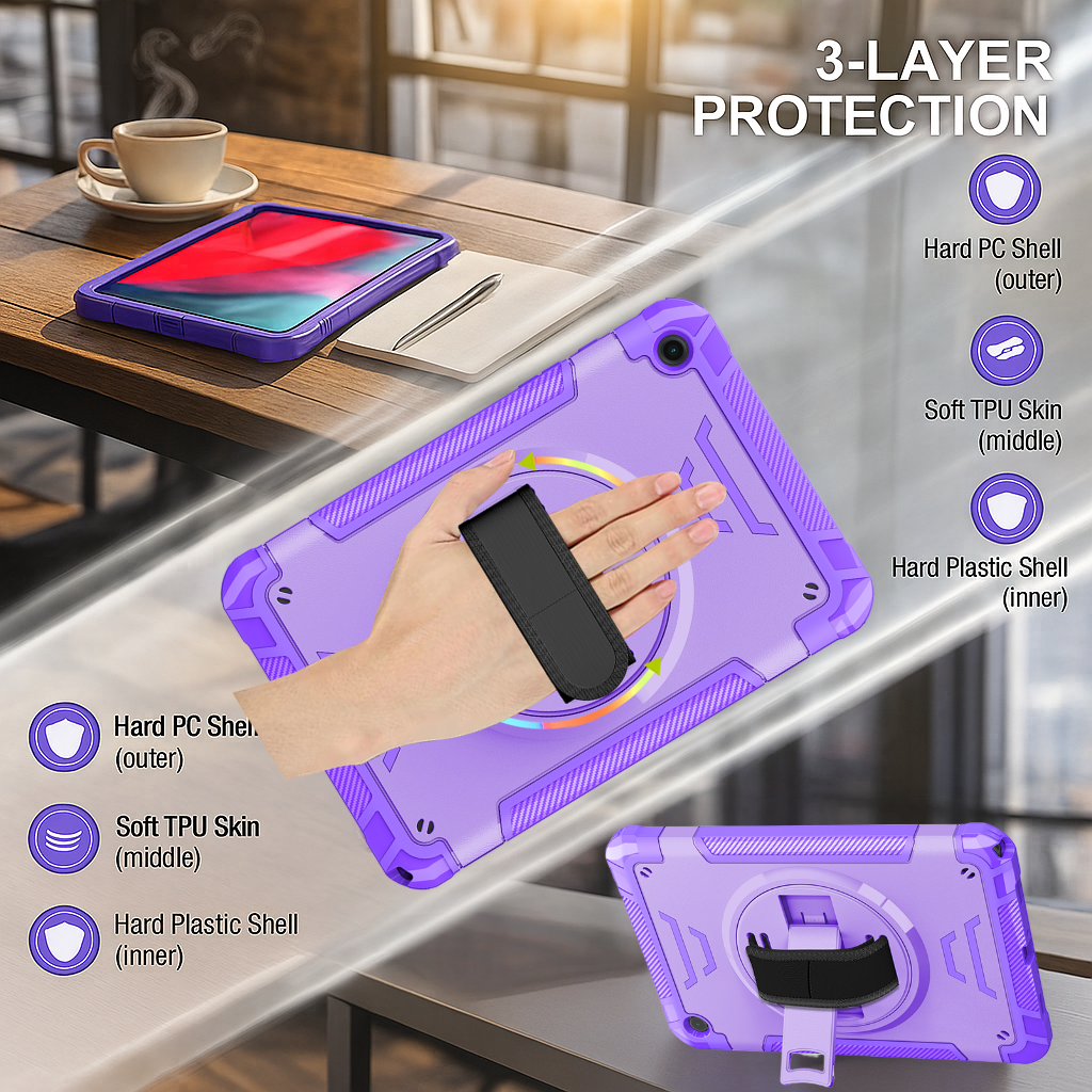 The built-in rotating hand strap allows effortless one-handed operation, perfect for students, field workers, teachers, and professionals who require tablet mobility and stability.
